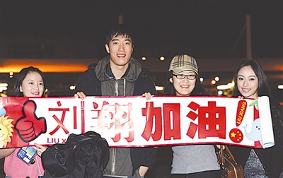 3月9日,中国运动员刘翔(左二)和举着“刘翔加油”横幅的女“翔迷”们合影。当日,刘翔和参加世界室内田径锦标赛的中国田径队抵达多哈。世界室内田径锦标赛将于12至14日在卡塔尔举行。新华社发(陈少金 摄)