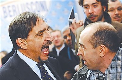 3月10日,意大利总理贝卢斯科尼在一场新闻发布会上遭遇记者干扰,贝卢斯科尼要求把记者赶出场。国防部长拉鲁萨抓住记者并大骂其“笨蛋”,场面一片混乱。谢涛 供图