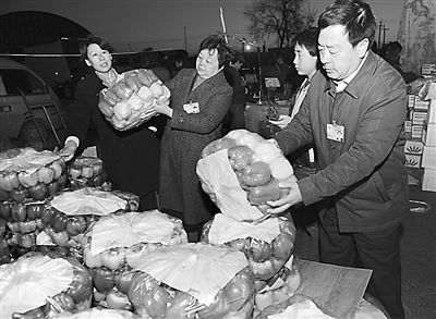 3月12日,全国人大代表刘建文(左一)、王银香(左二)和牛宝伟(右一)在北京新发地批发市场查看一种无公害辣椒的包装。