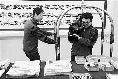 为了给观众呈现出更为鲜活、独特的视频画面,参加两会报道的摄像记者绞尽脑汁,采用多种方式和机位采访拍摄。这是在两会新闻中心,一家电视台的摄像记者情急之下借来酒店的行李车充当滑轨。新华社记者 李紫恒 摄