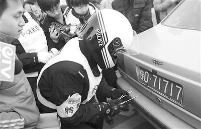 3月9日,在西安市南门外,交警将一辆套牌“警车”的牌子卸下。