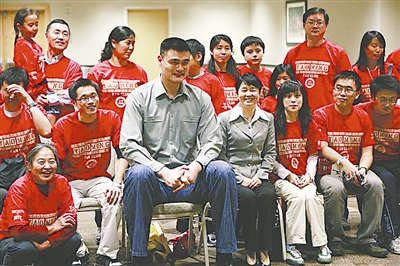 3月13日,火箭队球员姚明与姚明球迷俱乐部成员合影。当日,在休斯敦火箭队主场迎战新泽西网队的比赛前,姚明在火箭队的荣誉室与300多位姚明球迷俱乐部成员见面并合影留念。新华社发