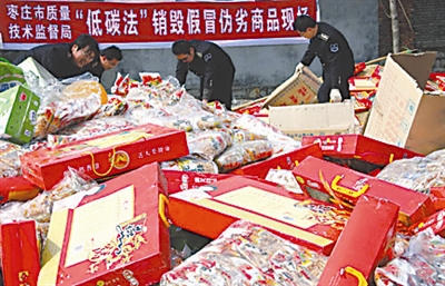 3月13日,枣庄市质量技术监督局执法人员在使用“低碳法”销毁假冒伪劣商品。当日,在山东省枣庄市开展纪念“3·15”国际消费者权益日打假维权销毁活动中。他们一改往年“一把火”销毁的形式,按照“分门别类、回收利用、科学销毁、保护环境”的原则,使用“低碳法”销毁假冒伪劣商品。吉 喆 王光立 摄