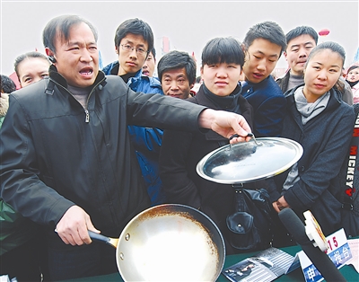 3月14日,山东淄博在博物馆广场举行3·15国际消费者权益日纪念大会,在设立的12315投诉举报中心,市民就日用品、药品、食品、房产等进行投诉,工商、消协、质检等有关职能部门现场予以解决,同时教市民识别食品、药物、钱币等的真假,受到市民欢迎。图为一消费者在现场投诉不粘锅质量问题。 董乃德 摄