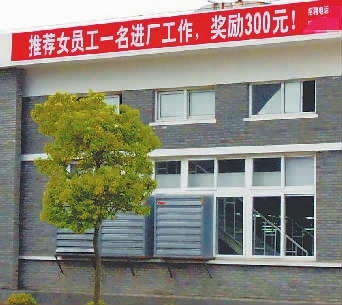 福建一家鞋厂为招到工人,实行“招工奖励政策”:推荐一名女员工进鞋厂工作者,奖励300元。 林丹 摄