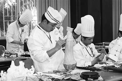 刀起刀落,上下翻飞,原本不起眼的南瓜、瓜果等原材料经过名厨一番雕刻,变成了形态各异的具有美学价值的艺术品。3月17日至19日,海峡两岸厨艺交流赛在福州举行,来自海峡两岸的200多名厨师参加了比赛。本报记者 吴铎思 本报通讯员 薛晓秋摄