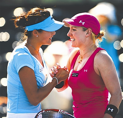 3月17日,中国选手晏紫(左)与美国选手桑兹在比赛后庆祝胜利。当日,在印第安韦尔斯网球赛女双四分之一决赛中,晏紫/桑兹以2比1战胜西班牙选手维韦斯/桑切斯,晋级四强。新华社记者 戚恒 摄