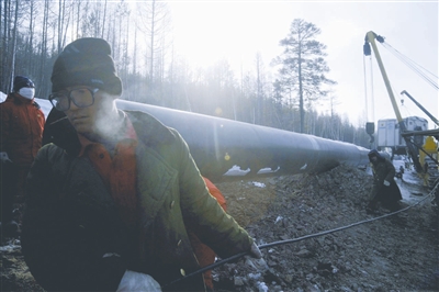 3月9日,中俄原油管道建设者在大兴安岭的严寒天气下施工。