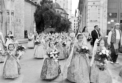 3月18日,在西班牙巴伦西亚,手捧鲜花的法雅女童参加法雅节盛装游行。