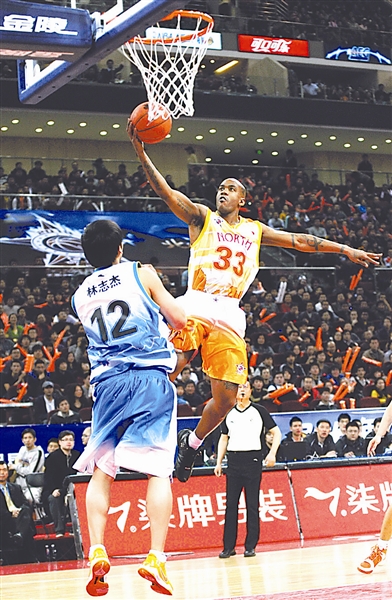 3月21日晚,CBA全明星篮球赛在北京五棵松体育馆举行,最后北方球队以133:121战胜南方球队。图为本次比赛的最佳球员马布里在上篮。本报记者 许之丰 摄