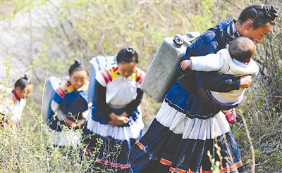 贵州省水城县发箐乡发嘎村第三村民组的苗族群众在背水(3月19日摄)。 新华社记者 杨楹 摄