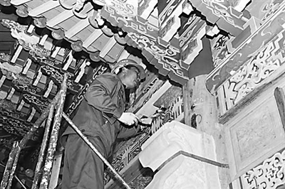 一名工人在中国馆内进行彩绘。 本报记者 张宪 摄