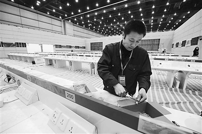 工作人员正在世博会新闻中心公共大厅内安装线路。 本报记者 张宪 摄
