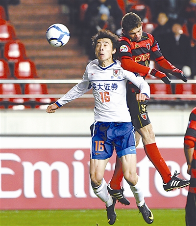 3月24日,山东鲁能队球员郑铮(前)与浦项制铁队球员莫塔争顶头球。当日,在亚冠联赛小组赛H组第三轮比赛中,中国山东鲁能队客场以0比1不敌韩国浦项制铁队。