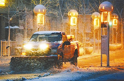 3月23日,美国科罗拉多州遭遇强风和大雪袭击,部分巴士线路被迫关闭,人们出行受阻。图为扫雪车在积雪的道路上工作。谢涛 供图