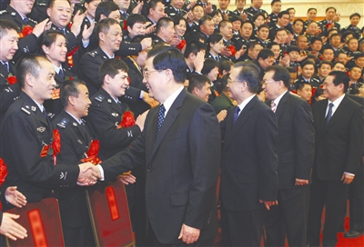 胡锦涛说,长期以来,全国公安机关和广大公安民警、武警官兵牢记宗旨、恪尽职守,顽强拼搏、默默奉献,为维护社会和谐稳定、保障人民安居乐业作出了重大贡献,涌现出一大批事迹感人的先进模范。这次受到表彰的同志就是其中的优秀代表,你们以自己的实际行动践行了“人民公安为人民”的庄严承诺,党和人民感谢你们。希望同志们保持荣誉、再接再厉,在各自工作岗位上做出更大成绩。