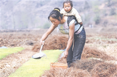 龙潭镇茨德陶家村的村民范丽琼背着孩子下地给稻苗浇水(摄于3月25日)。