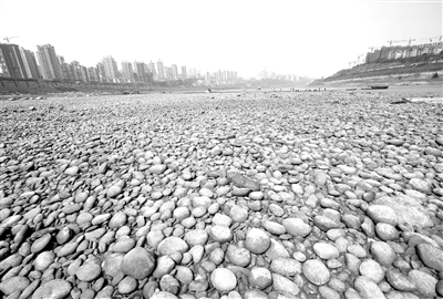 由于长时间未雨,长江、嘉陵江重庆段水位持续下降。据北碚水文站监测数据,3月3日嘉陵江水位为-0.17米,达到1939年建站以来的最低水平。长江重庆段水位同样不容乐观,据重庆海事局介绍,长江重庆段水位3月4日已降到1.1米,如半个月内水位再持续下降,将突破2007年-1.92米的最低水位。