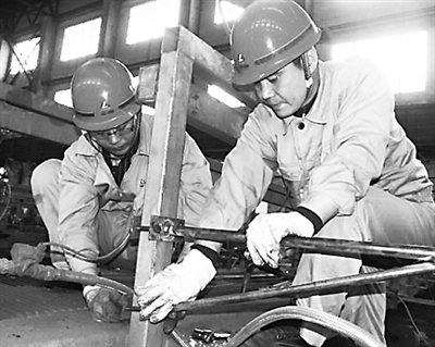 3月24日,中铝河南分公司碳素厂检修车间钳工三班研制的小支架终获成功,由班长刘书贵(左一)将其装到焙烧炉燃烧架上。由于燃烧架枪座温度高且笨重,操作工移炉不但效率低,而且易发生烫伤事故。钳工三班经实际测量、计算,做小支架把枪座和燃烧架连在一起。不仅避免了移炉时发生烫伤事故,而且还缩短一半移炉时间。 刘海涛 摄