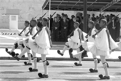 3月25日,在希腊首都雅典的宪法广场,人们参加独立战争纪念日庆祝活动。 新华社发(马里奥斯·罗洛斯 摄)