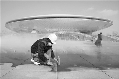 3月26日,施工人员在世博文化中心前调试灯光喷泉。