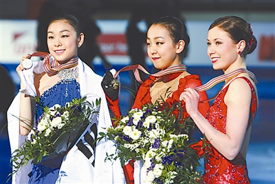 3月27日,冠军日本选手浅田真央(中)、亚军韩国选手金妍儿(左)与季军芬兰选手莱皮斯特在领奖台上。当日,在意大利都灵举行的世界花样滑冰锦标赛上,日本选手浅田真央以197.58分的总成绩夺冠。新华社发(黄小哲 摄)