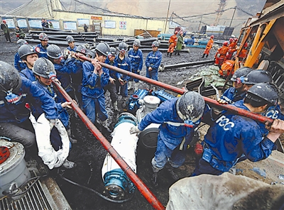 记者29日下午在抢险现场看到,除了已安装的排水系统,拉运水泵、水管、电缆等抢险物资的车辆,在现场外面的狭窄山路上排成了长队。7支专业救护队的200余名救护人员每4小时一轮换,轮番下井抢险作业;20辆救护车和两支医疗队的40多位医护人员24小时在井口外待命。