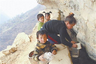 3月28日下午,四川泸州市叙永县水潦彝族乡岔河村的几名彝族孩子在悬崖绝壁上的一条引水渠中汲取生活用水。该水渠渠边平均宽度仅1米多,渠外是万丈深渊,稍有不慎后果不堪设想。邱海鹰 王承伟 摄