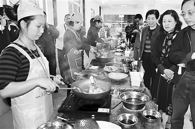 3月31日,几位参赛家政服务人员在进行烹饪比赛。