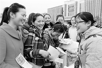 4月1日,安徽省亳州市幼儿师范学校几名毕业生在供需洽谈会上一起交流。当日,在亳州市幼儿师范学校举行的2010届大中专毕业生供需洽谈会上,来自北京、上海、广东、浙江、江苏、河南等省市的268家用人单位为600名幼师毕业生提供就业岗位2460个,平均每位毕业生有4个可以自己选择的就业岗位。 新华社发(张延林 摄)