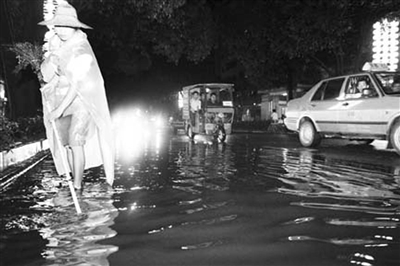 4月1日傍晚,广西壮族自治区百色市旱情最为严重的那坡、凌云等县(区)迎来自去年8月以来的首次降雨,该市的田东县等地下起了大雨,其他地区均达到中雨以上,旱情得到一定程度缓解。图为百色市的环卫工人在雨中清理被淹的中山二路地下水道。 南沙 摄