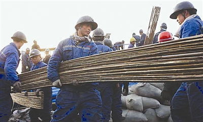 4月4日,救援人员正在搬运竹排。为防止井下巷道泥泞湿滑,救援人员于当日下午6点开始向井下运送竹排。至4日18时30分,王家岭矿透水事故大规模下井救援仍无法展开。但“3·28”透水事故抢险指挥部已经做好入井救援的一切准备,方案进一步完善,一旦水位下降条件成熟,马上展开救援。 新华社记者 高学余摄