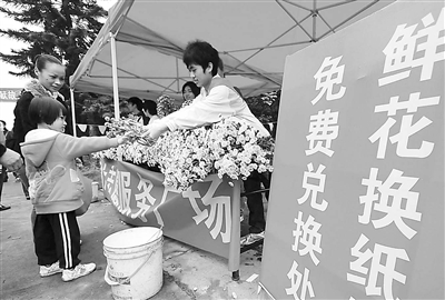 4月4日,在广西梧州仙风山墓园的“鲜花换纸钱”免费兑换处,志愿者将鲜花递给一位前来扫墓的小朋友。当日,广西梧州市青年志愿者在梧州市仙风山墓园举行“鲜花换纸钱”活动,志愿者们引导和劝服前来墓园扫墓的市民将祭拜用的纸钱、冥币、“元宝”等传统纸质祭祀品和香火蜡烛等物品换成鲜花,倡导文明环保祭祀。 新华社发(何鎏 摄)
