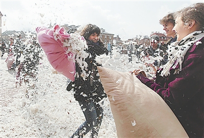 4月3日是国际“枕头大战”日。多个国家的“枕头大战”爱好者在这一天相约走上街头,挥舞着枕头庆祝节日。图为在比利时首都布鲁塞尔的皇家铸币局剧院广场上,枕头中的羽绒漫天飞舞。肖劼 供图