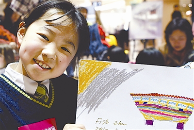 4月5日,10岁的小学生林馨语展示自己描绘的世博会中国馆图画。