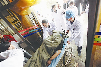 图为一名获救矿工被送到山西省河津市人民医院接受治疗。