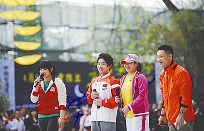 4月5日,中国体操全民健身万里行来到都江堰。国家体操队、艺术体操队、技巧队和健美操队一行49人为灾区人民和游客献上精彩的表演。图为奥运冠军刘璇、邹凯、程菲和杨威(从左至右)在表演现场。