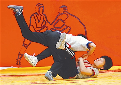 4月6日,两名摔跤选手在比赛中。河南省首届中国式摔跤跤王赛于4月5日在古城开封的翰园碑林景区开赛,来自全省各地的60多名民间摔跤好手将在4天的比赛中决出各个级别的“跤王”。新华社记者 王颂 摄