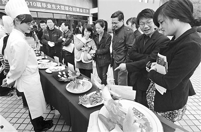 4月7日,用人单位代表在展示现场与应届毕业生进行洽谈。当日,在浙江旅游职业学院举办的应届毕业生供求见面会上,该校烹饪专业的50多名毕业生在现场亮出了自己烹饪的拿手菜,每个人的厨艺水平及特长从菜式上就可一目了然,任由需要招收厨师单位的专业人员“看菜”挑人。当日,共有来自浙江省内的160多家用人单位参加了招聘会。 施健学 摄