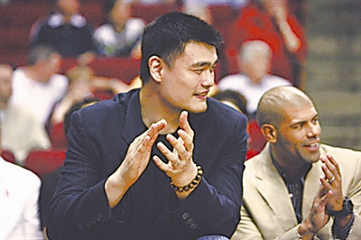 当地时间4月7日,火箭队球员姚明(左)到场为火箭队助威。当日,在NBA常规赛中,休斯敦火箭队主场迎战犹他爵士队。