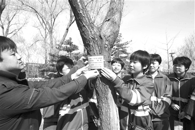 当日,北京五中分校初二9班的30多名学生在老师的带领下,在北京地坛公园园外园举行树木认养活动。学生们用自己义卖图书、文具、书法作品筹到的1500多元钱,认养了30棵树。东城园林绿化局派园林技术人员到现场教授学生养树、护树常识。 新华社发(周良 摄)