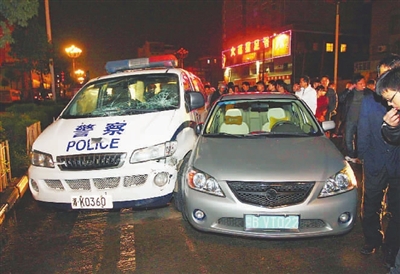 日前,湖南省娄底市公安局刑侦支队重案大队长曾某驾驶湘K0360警牌照警车办案返回市区时,将两名男子撞伤后肇事逃逸。市民洪海军开车将曾某拦截并交于巡逻民警。图为市民洪海军驾驶的粤B-VT022小车成功将撞人逃逸的警车湘K0360警拦截现场。