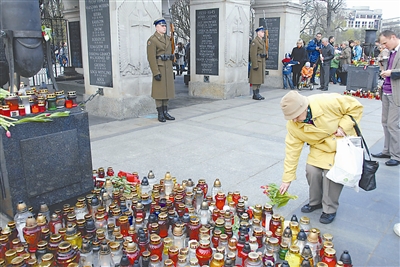 4月11日,人们在波兰首都华沙的无名烈士墓广场参加波兰总统卡钦斯基专机遇难者的悼念仪式。卡钦斯基及夫人乘坐的图-154专机当地时间10日在俄罗斯斯摩棱斯克失事,机上96人无一生还。