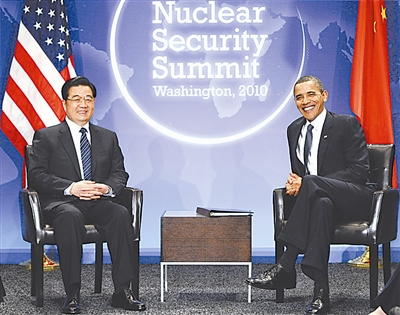 4月12日,出席核安全峰会的国家主席胡锦涛在华盛顿会见美国总统奥巴马。