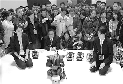 4月8日,国产机器人的表演吸引了不少市民前来观看。当日,第九届中国重庆高新技术交易会暨第五届中国国际军民两用技术博览会开幕。