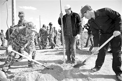 4月12日,部队官兵与银川永宁县闽宁镇干部群众开展植树活动。当日,该镇干部群众与驻地部队官兵在包兰铁路沿线共同开展义务植树活动,在铁路沿线筑起绿色屏障。