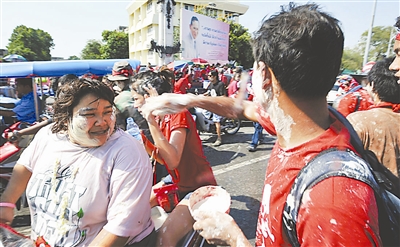 4月13日,泰国“红衫军”成员在曼谷用泼水、涂粉的方式庆祝“宋干节”(泼水节)。当日是泰国传统的“宋干节”,众多“红衫军”成员在繁华桥集会地点举行多种形式的庆祝活动。新华社记者 黄晓勇 摄