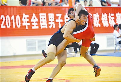4月14日,云南队选手韩跃平(左)在74公斤级比赛中战胜新疆队选手买买提江艾。当日,为期四天的2010年全国男子自由式摔跤锦标赛进入第二天的比赛。