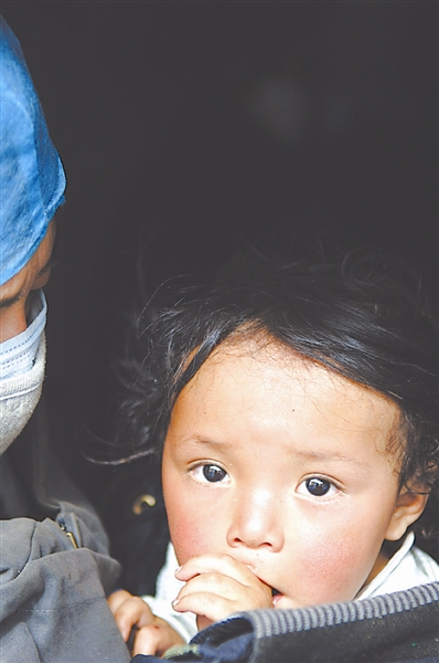 4月15日,结古镇一处救灾帐篷内,一名在地震中幸存的藏族小女孩依偎在医生怀里。
