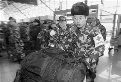 4月15日,西宁机场,来自广东边防总队的113名医护人员准备登机前往玉树地震灾区实施医疗救援。本报记者 杨登峰 摄